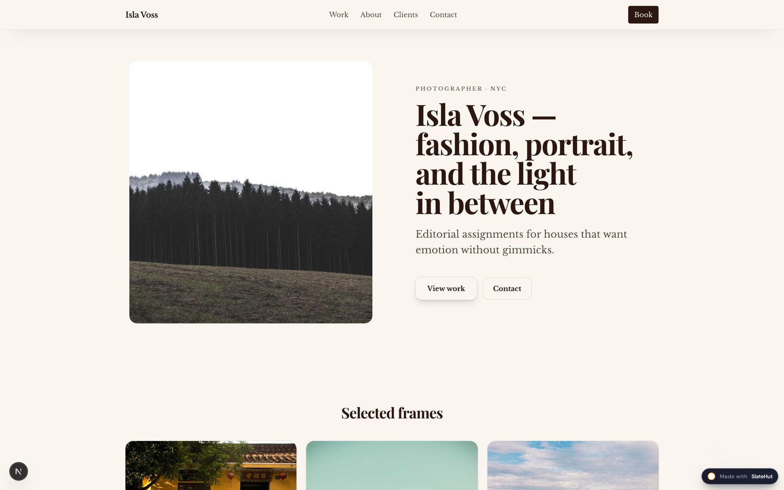 Describe your craft and ideal clients. SlateHut assembles a portfolio structure you can refine — galleries, story sections, testimonials, and a clear contact path.