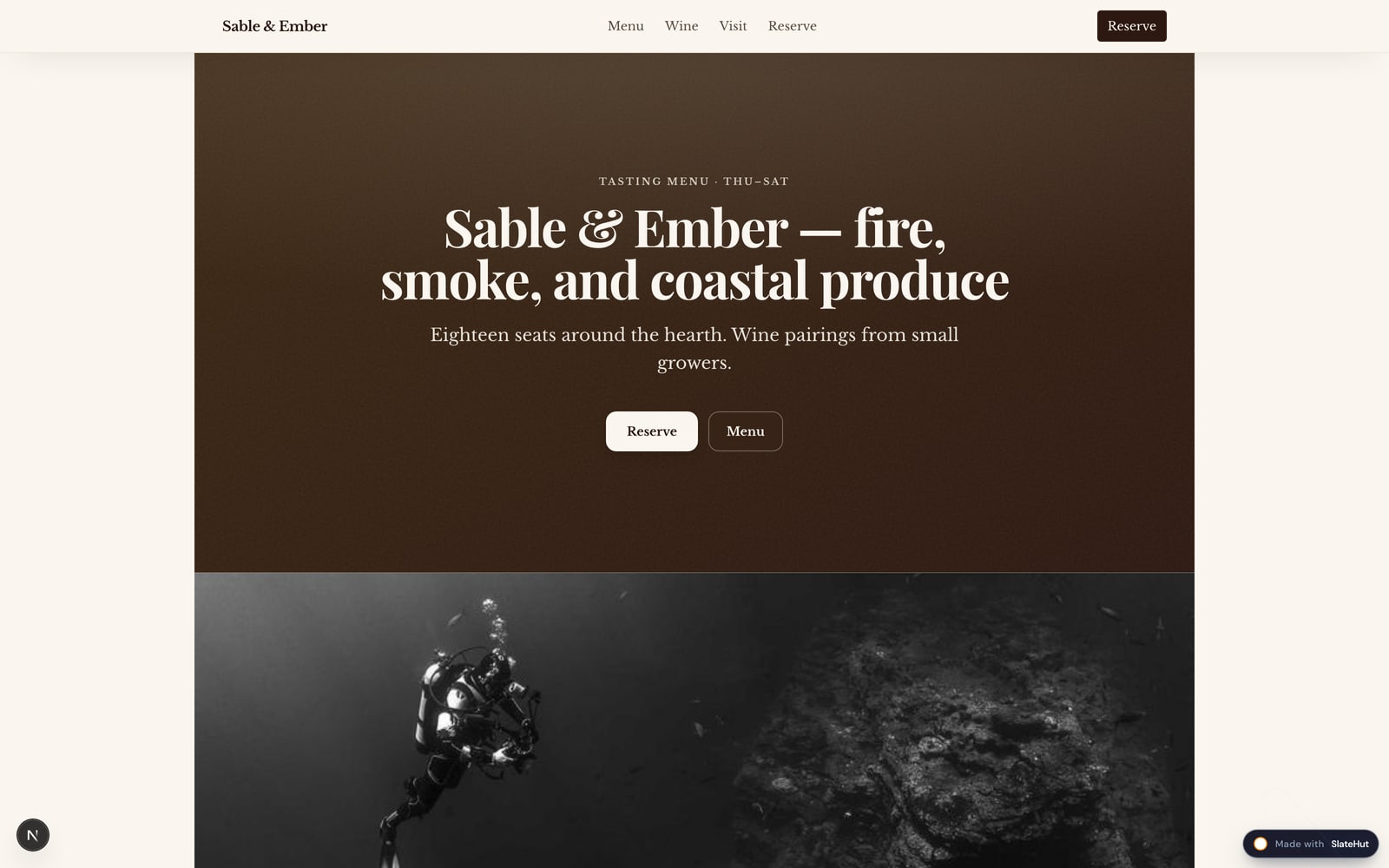Describe your concept, location, and specialties. SlateHut proposes heroes, services, gallery-friendly sections, hours-style blocks, maps, and contact — tuned for phones first.